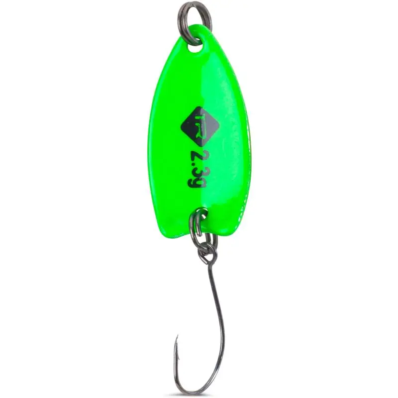 Trout spoon with high-contrast designed front and back! Since artificial bait with treble hooks cannot be used on some waters, this model is equipped with an extremely sharp single hook.