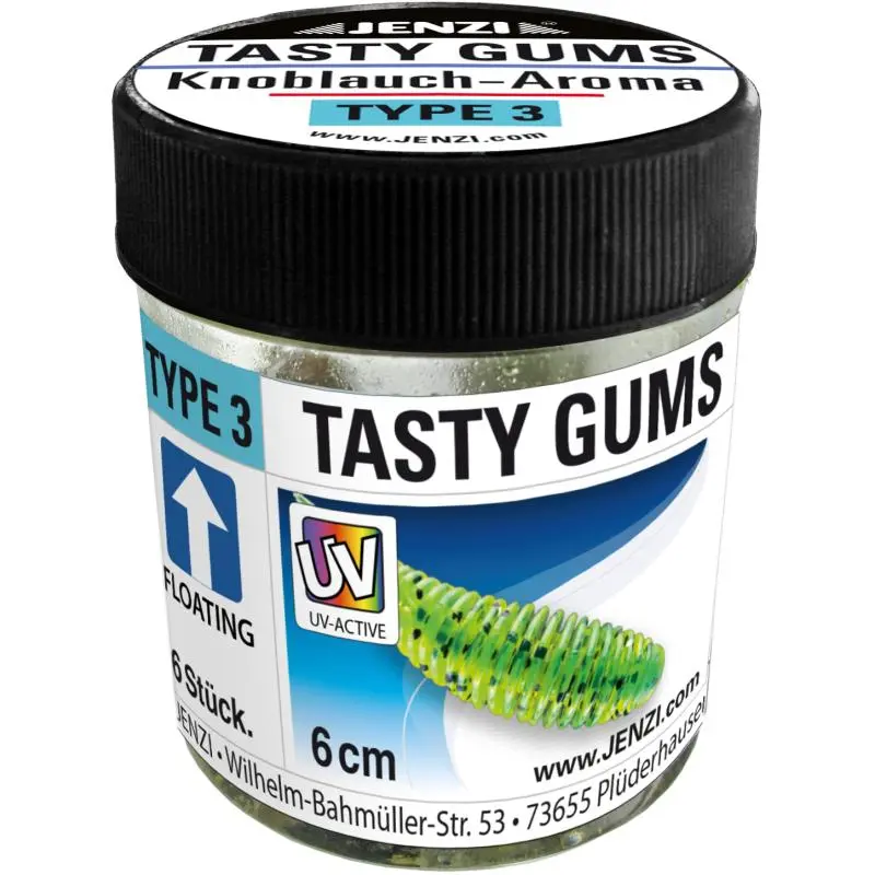 - All TASTY GUMS rubber fish and baits come in a practical, resealable can.